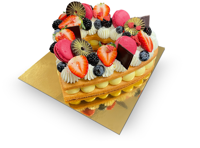 Composition: Creme Patissieres, Shortbread Dough, Chantilly Cream, Additional Decorative Assortments of Chocolate, Macarons, and Fruits.
