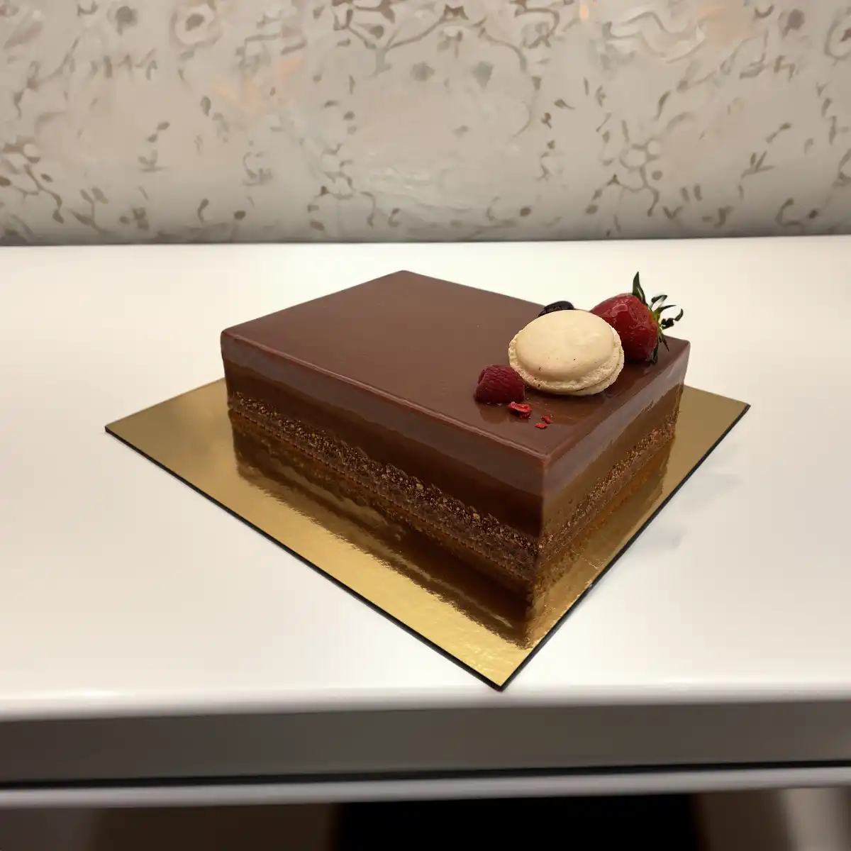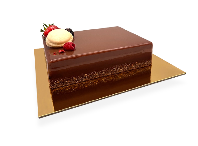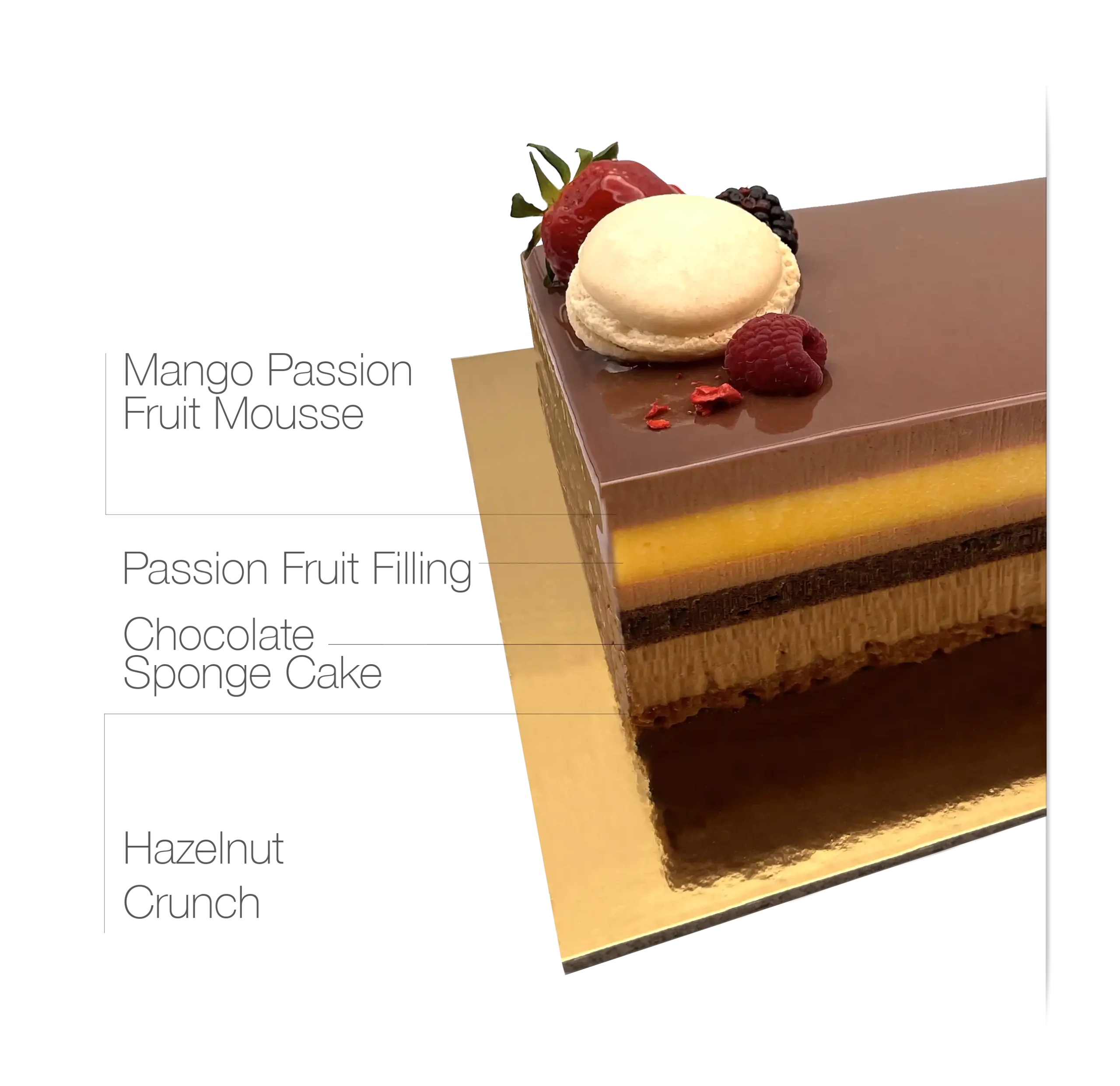 Composition: Mango Passion Fruit Mousse, Passion Fruit Filling, Chocolate Sponge Cake ,Hazelnut Crunch, additional decorative assortments of chocolate, macarons and fruits.