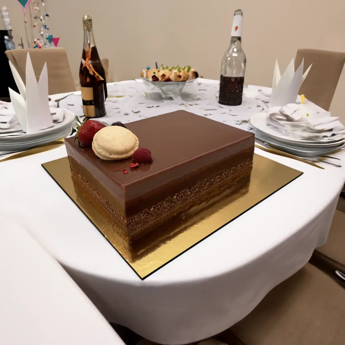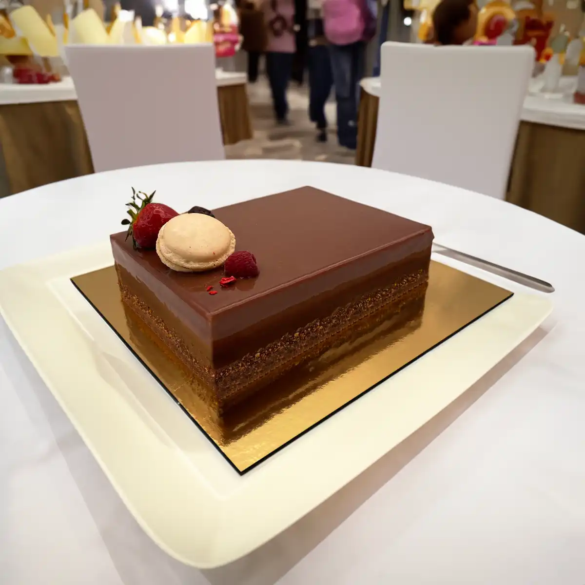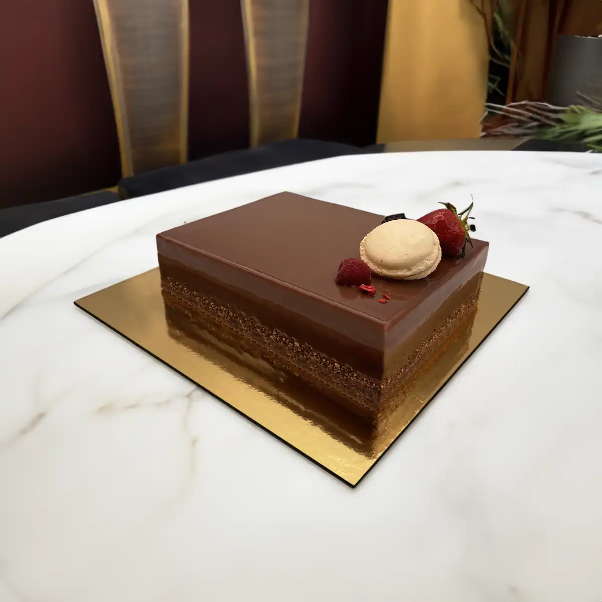 Composition: Mango Passion Fruit Mousse, Passion Fruit Filling, Chocolate Sponge Cake ,Hazelnut Crunch, additional decorative assortments of chocolate, macarons and fruits.