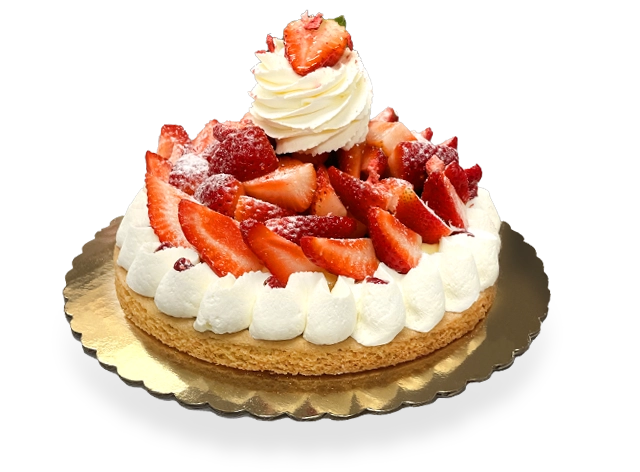 Composition: Sweet tart dough, crème pâtissière, raspberry filling, fresh strawberry and fresh Chantilly cream.