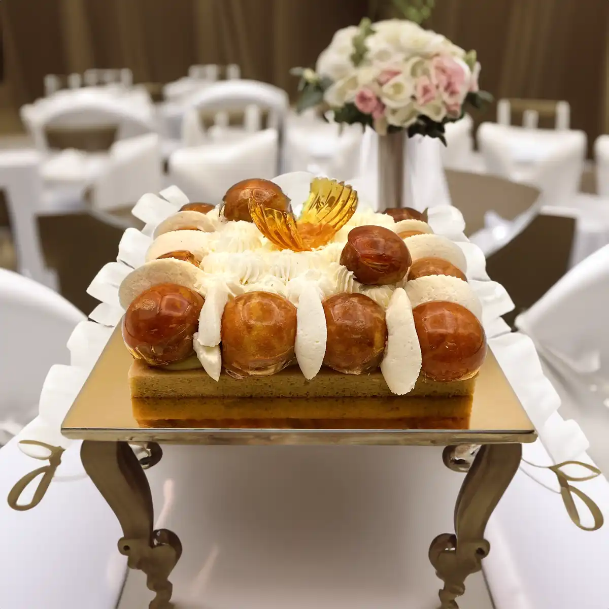 Wedding Cake Saint Honoré. Made with love and the finest ingredients. At first glance, the saint honoré cake cake is a sight to behold. Towering layers of delicate puff pastry rise gracefully, offering a crisp and flaky foundation. Each layer is expertly baked to perfection, providing a heavenly contrast to the sumptuous fillings that lie ahead.  As you take your first bite, you'll encounter the star of this enchanting creation—the luscious cream puff. These delectable morsels are nestled atop the cake, filled with a velvety smooth vanilla pastry cream that oozes with indulgence.