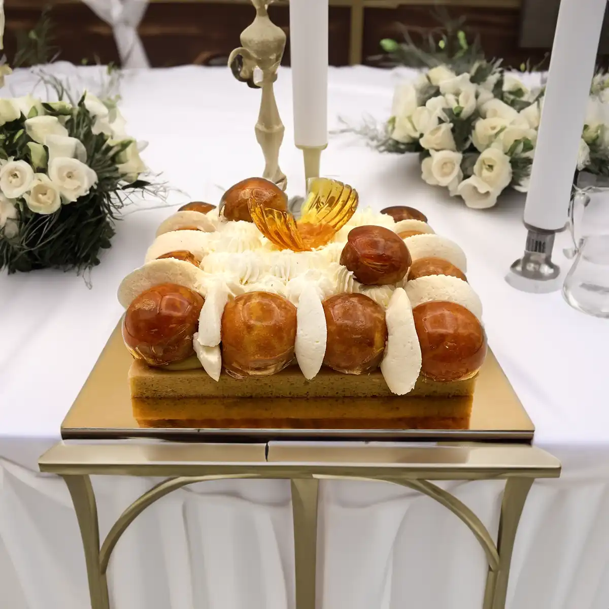 Wedding Cake. A fusion of elegance and decadence! Prepare to be enchanted by the sheer beauty and divine flavors of our saint honoré cake. This culinary masterpiece pays homage to the legendary French pastry, blending tradition with contemporary indulgence. Miam !